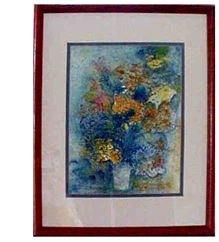 Watercolor 11" x 14" Framed size: 18" x 22" Frame: wood Price: $ 250 Named for the artist's choice of technique: The background color was painted on the back of the paper and then the flowers were added.